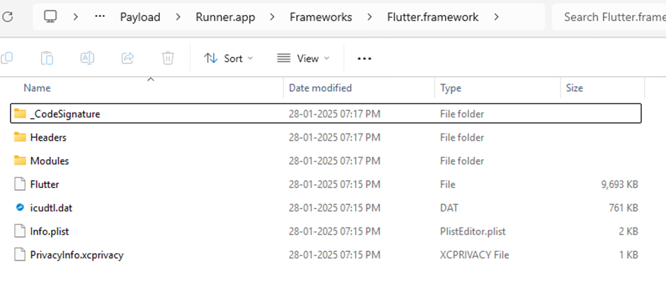 To verify if the application was built using Flutter, I renamed the .ipa file to .zip, extracted it, and then navigated to Payload/Runner.app/Frameworks/Flutter.framework, where Flutter-related files were present. This confirmed that the application was built using Flutter, as shown in the figure below: